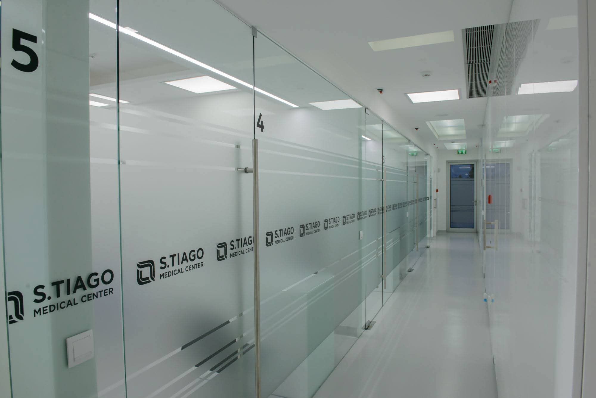 Os corredores amplos e envidraçados, com vidro fosco personalizado, garantem privacidade ao mesmo tempo que mantêm a transparência e a sensação de espaço.