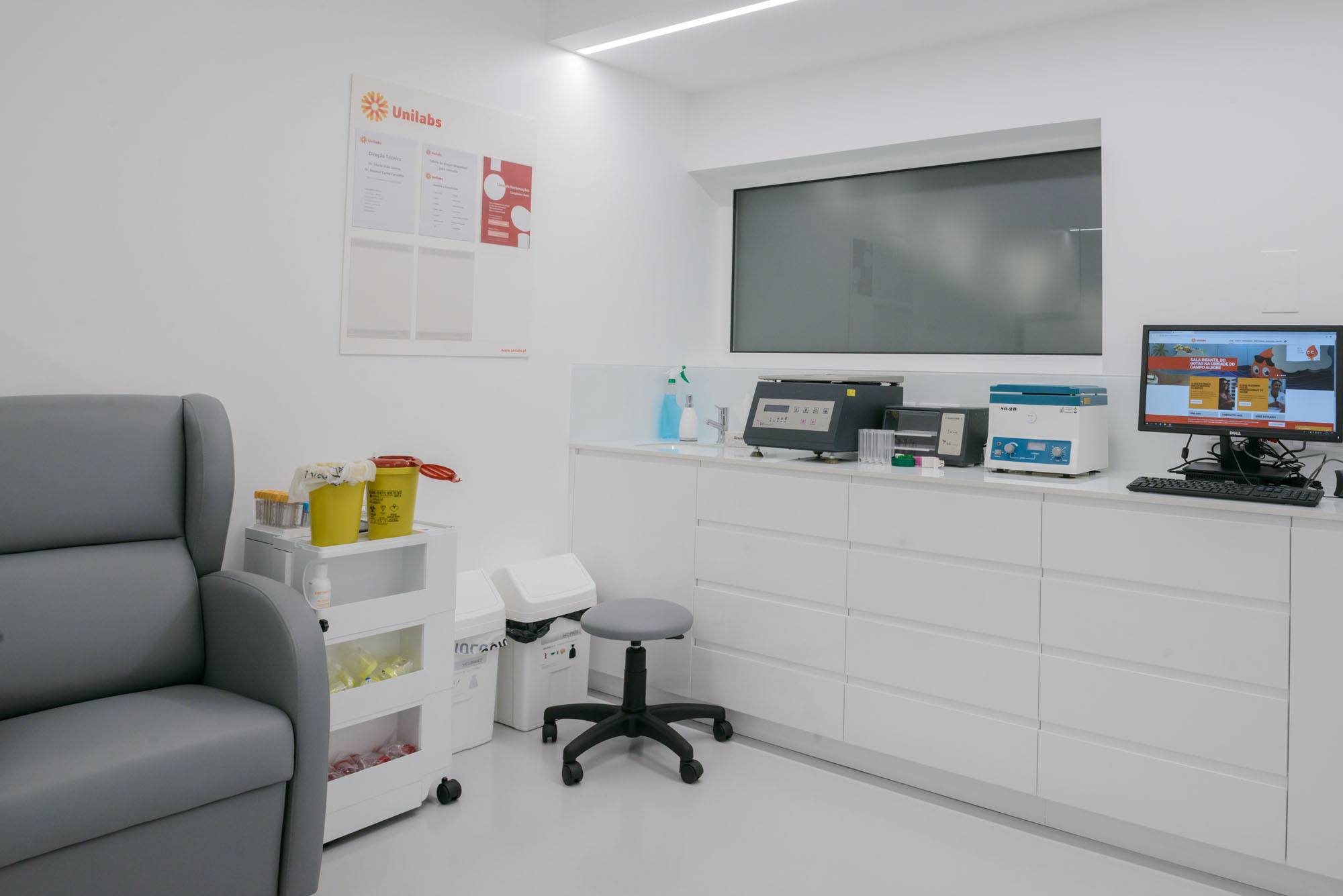 A iluminação é cuidadosamente distribuída para criar um ambiente sereno e livre de sombras duras, promovendo o conforto visual. Os acabamentos claros reforçam a perceção de limpeza e higiene, enquanto o design funcional facilita a circulação de pacientes e profissionais.